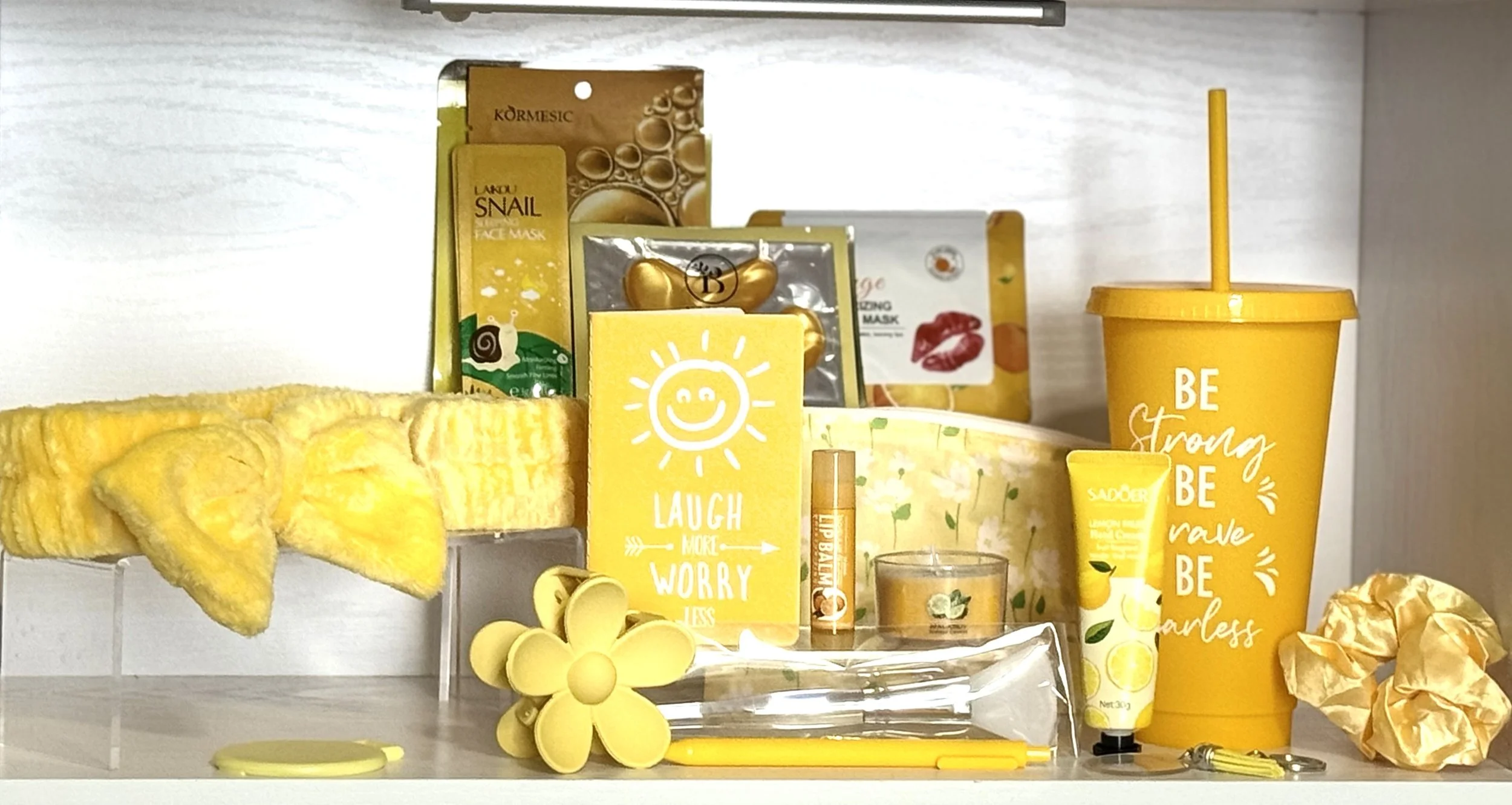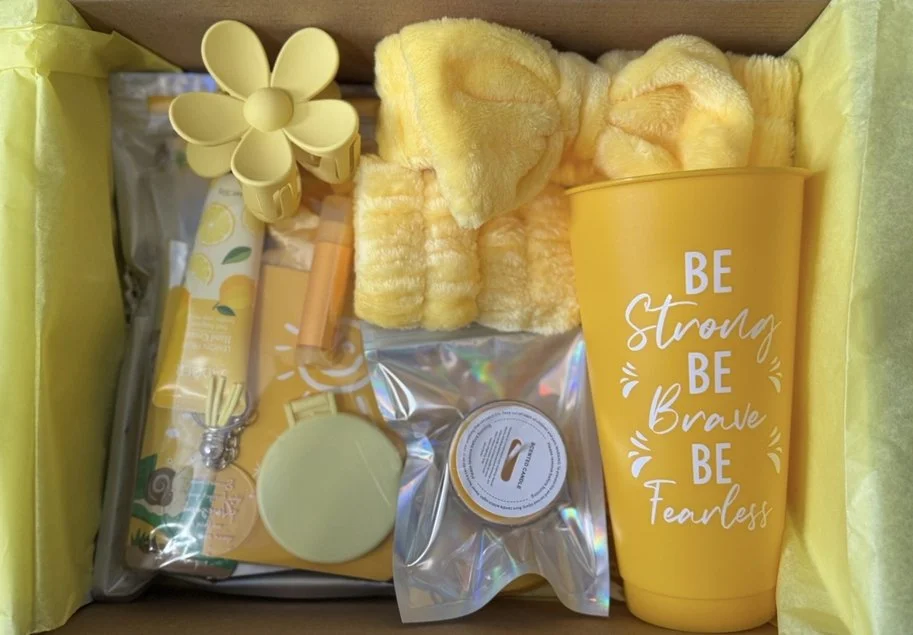 Self Care Starter Bundle includes Facewash headband w/wristbands, Facemask single sheets x2, Cream facemask packets x2, Mask applicator brush, Undereye patches x2, Lip mask patches x2, Lip balm, Hand lotion, Small Candle, Satin hair scrunchie, Hair clip, Compact mirror, Small makeup bag, Inspiration cup w/lid & straw and Mini Pocket journal w/pen & keychain.